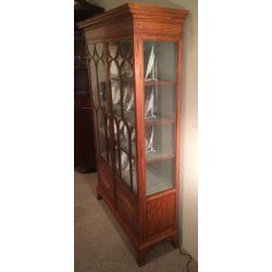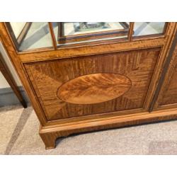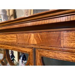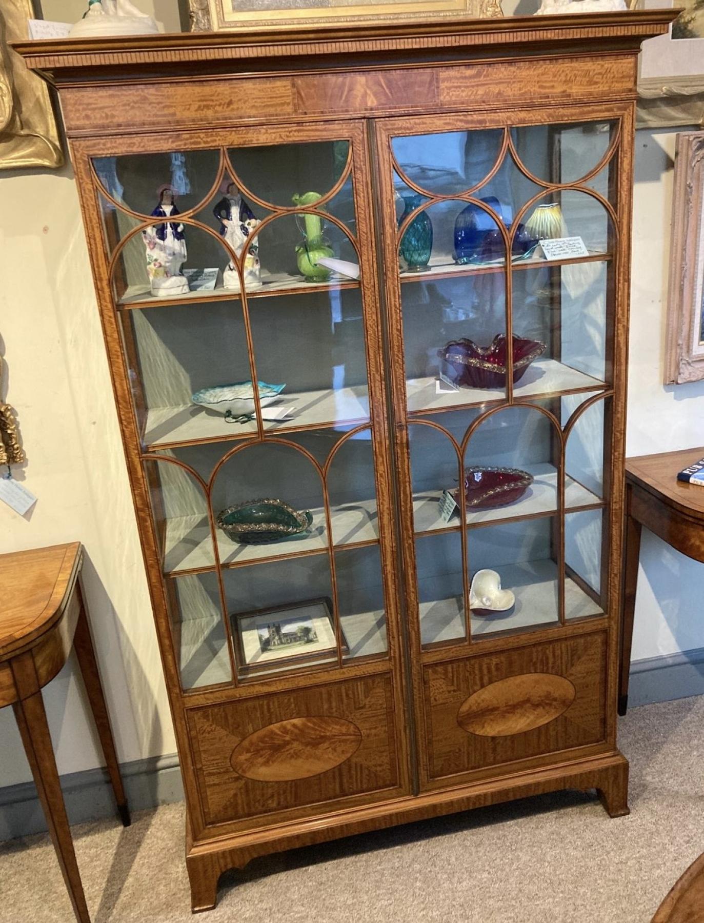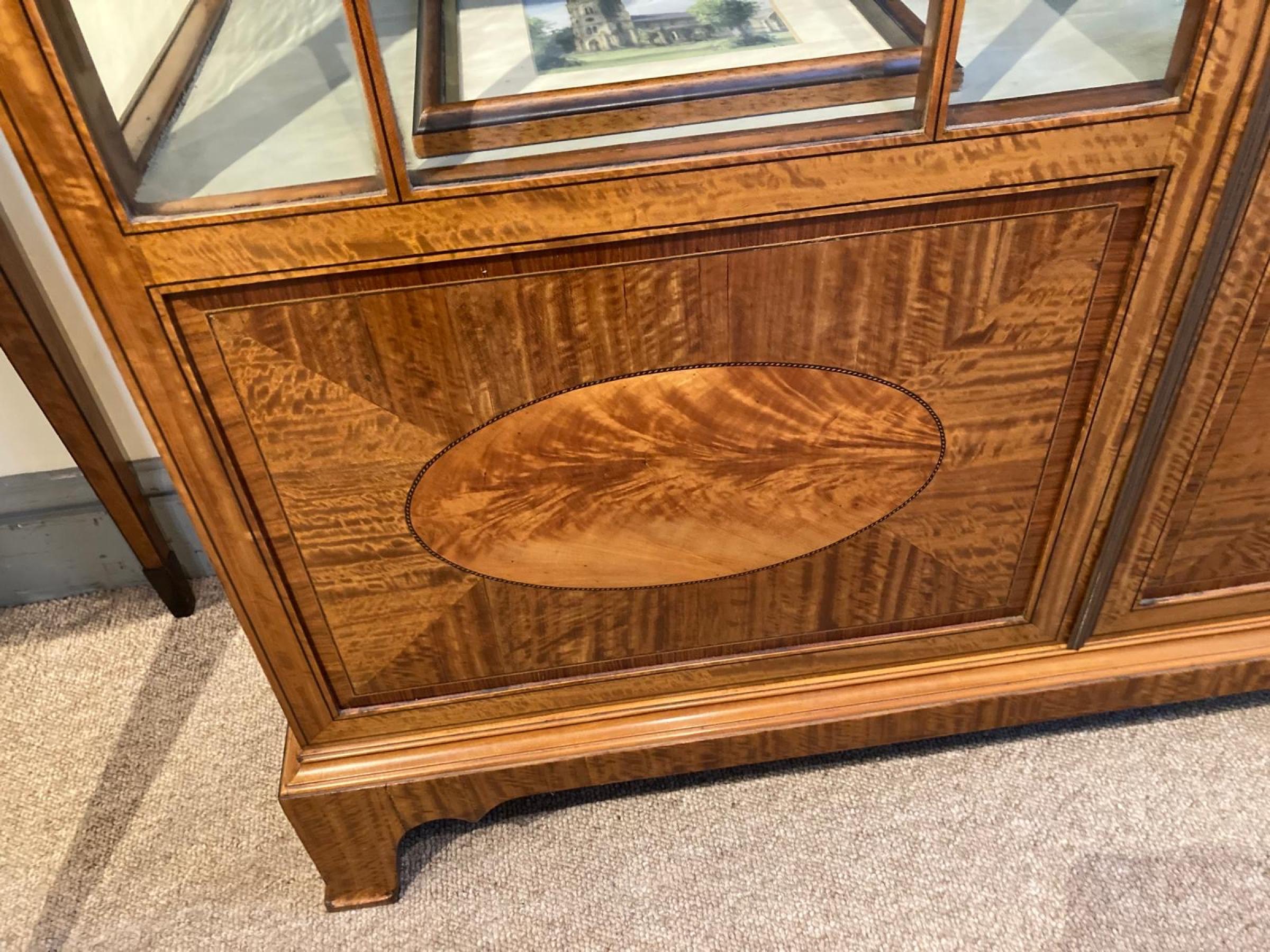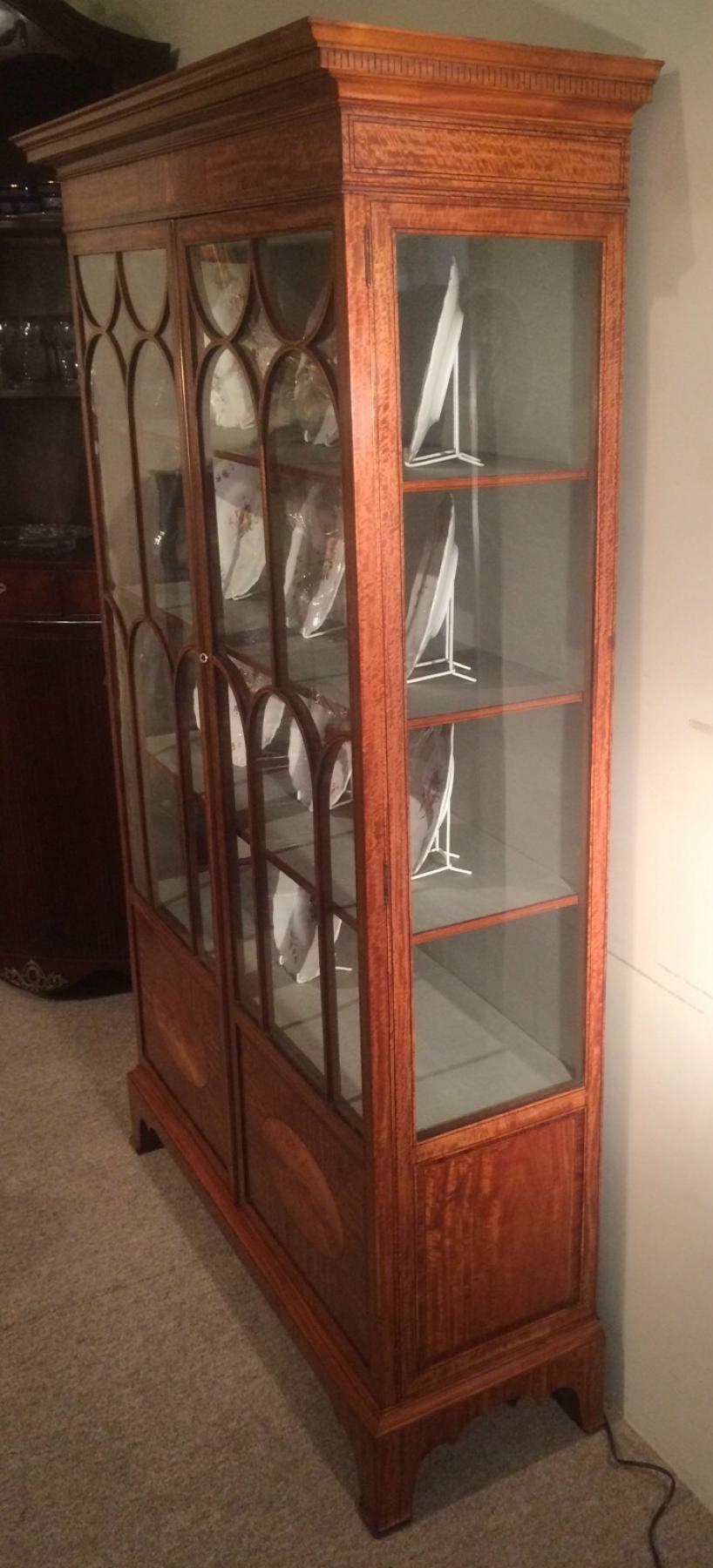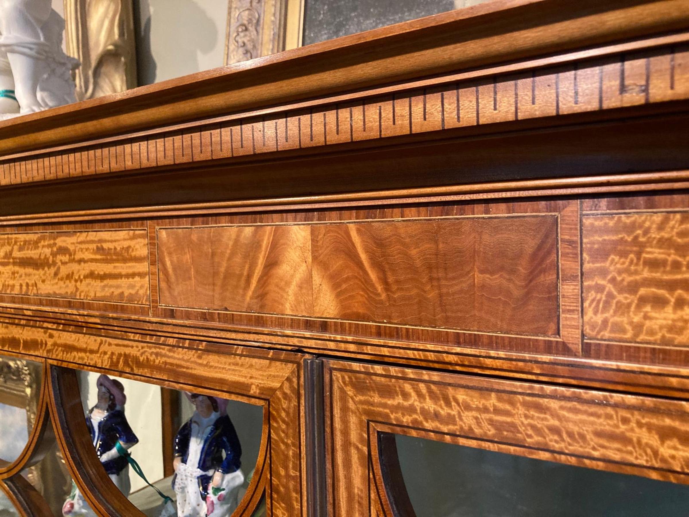 A Fine Sheraton style Satinwood Cabinet, Kingwood banded & line inlaid, the lower part of the doors with beautiful oval & quarter-veneered panels, the Satinwood panelled frieze crossbanded in Kingwood below a dentil cornice, the doors and sides with original glass and attractive arched glazing bars. Circa 1890
