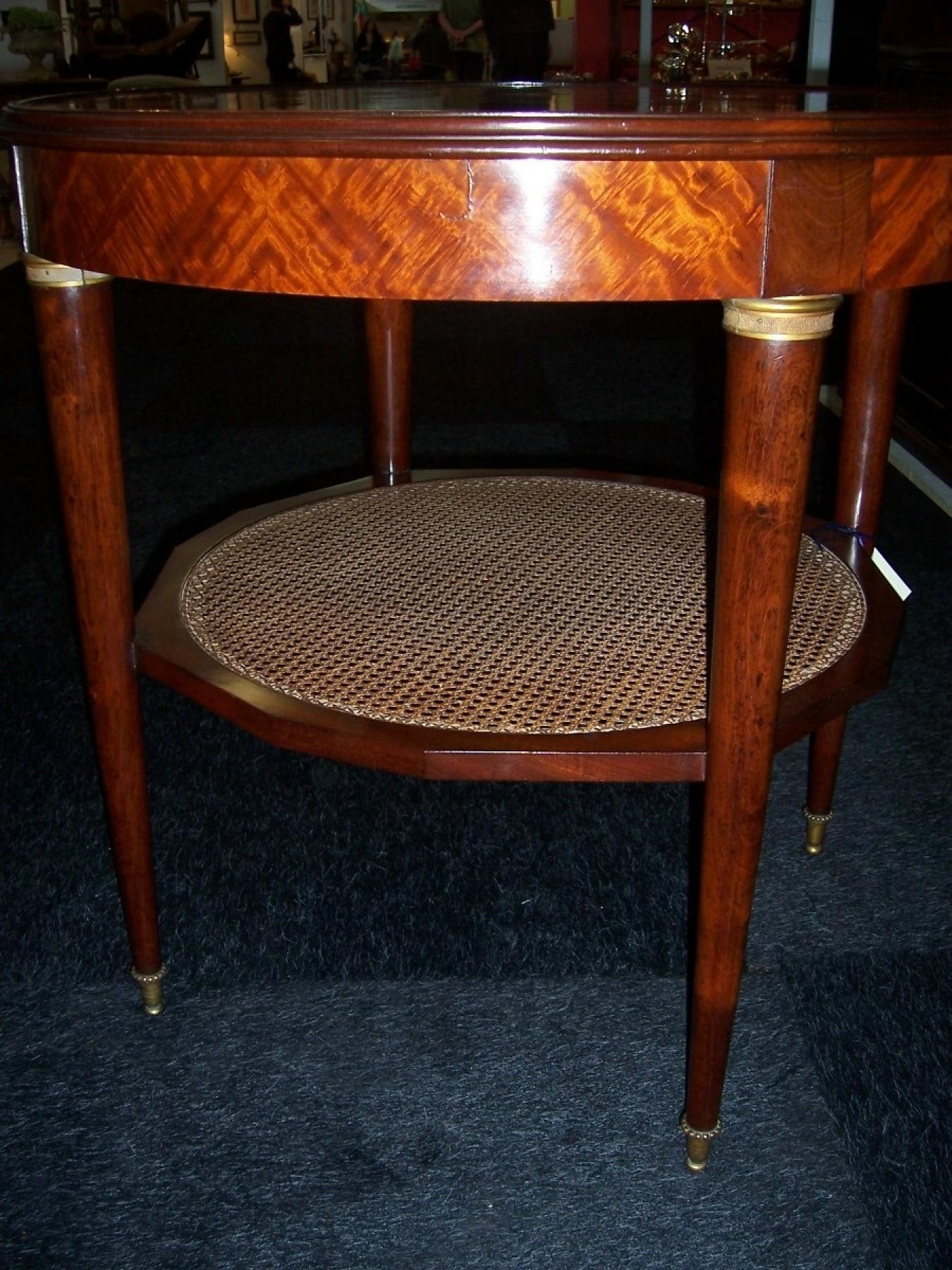 A Fine Quality French Mahogany and Gilt Metal mounted Centre Table by F Roche of Paris, with superb fingured segmental veneered top centred with a wedgewood jasperware plaque within gilt beading, outer dish rim, fine turned legs with ormolu cappings & feet, and caned under-tier. Bears label for maker, F Roche, Rue Jules Cesar, Paris. Circa 1900