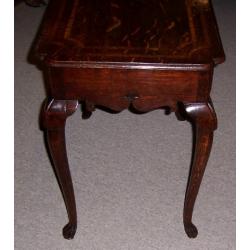 A most unusual Geo I Figured Oak 2-drawer Lowboy, the top inlaid with a central compass star, cross-banded in ash and feather-banded in walnut, with re-entrant corners, the drawers similarly inlaid, with shaped friezes to 3 sides and raised on unusual cabriole legs. Original brasses. Circa 1720