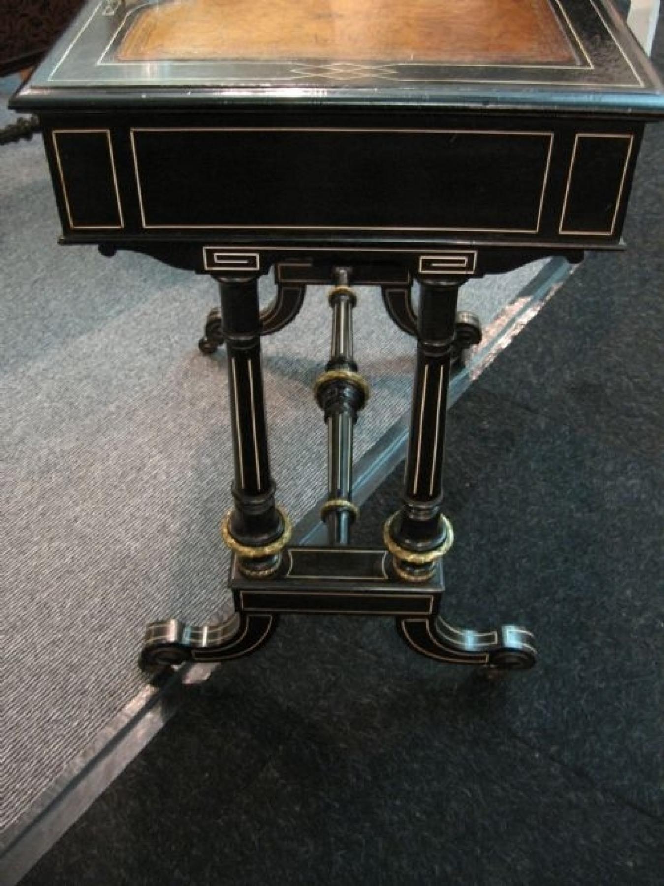 A Fine Quality 19th Century Writing cum Work Table attributed to Gillow & Co, in Ebonised Mahogany with ivory line inlay & gilt brass mounts, retaining the original inkpots & leather, the Writing Drawer lined in Maple, with Work Basket underneath. An aesthetically attractive and versatile piece of furniture