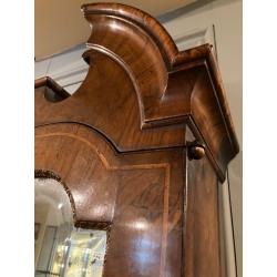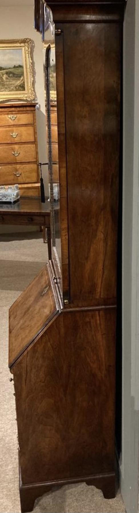 A Fine & Rare Walnut Bureau Cabinet with arched pediment above a bevelled mirrored door enclosing adjustable shelves, a candle slider above an interior of 3 small drawers, with 4 long drawers below, all oak lined - the whole of exceptional small size. Geo II, circa 1750