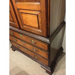 Geo II Oak Press Cupboard of superb quality, with fielded panel doors crossbanded in mahogany with a chequer line, the drawers featherbanded and with fruitwood cockbeading, the cornice, waist & base moulding superbly carved, probably en suite with interior woodwork at houses such as Mawley Hall & Davenport Hall. This Press also has a Shropshire provenance, perhaps indicating a local centre of carving excellence in the 2nd quarter of the 18th Century. Originally shelved, now with hanging rail. Original handles, later escutcheons (on drawers) and feet. Circa 1740. More photos available on request